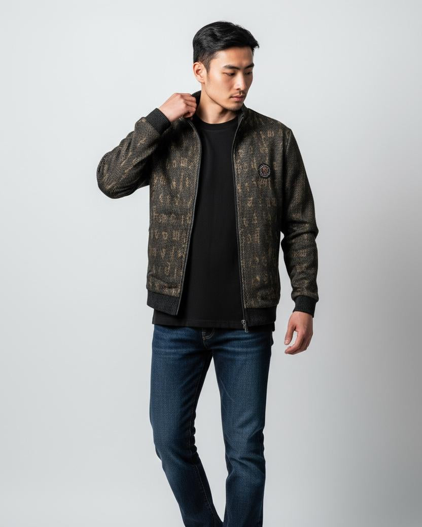 Crafted from a substantial, soft-touch fabric, this jacket offers lightweight insulation and a fit that looks effortlessly sharp. The subtle geometric [V or Herringbone] pattern provides sophisticated visual interest, while the clean collar, zip closure, and contrast cuffs anchor its modern, dynamic appeal.
