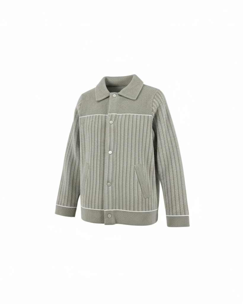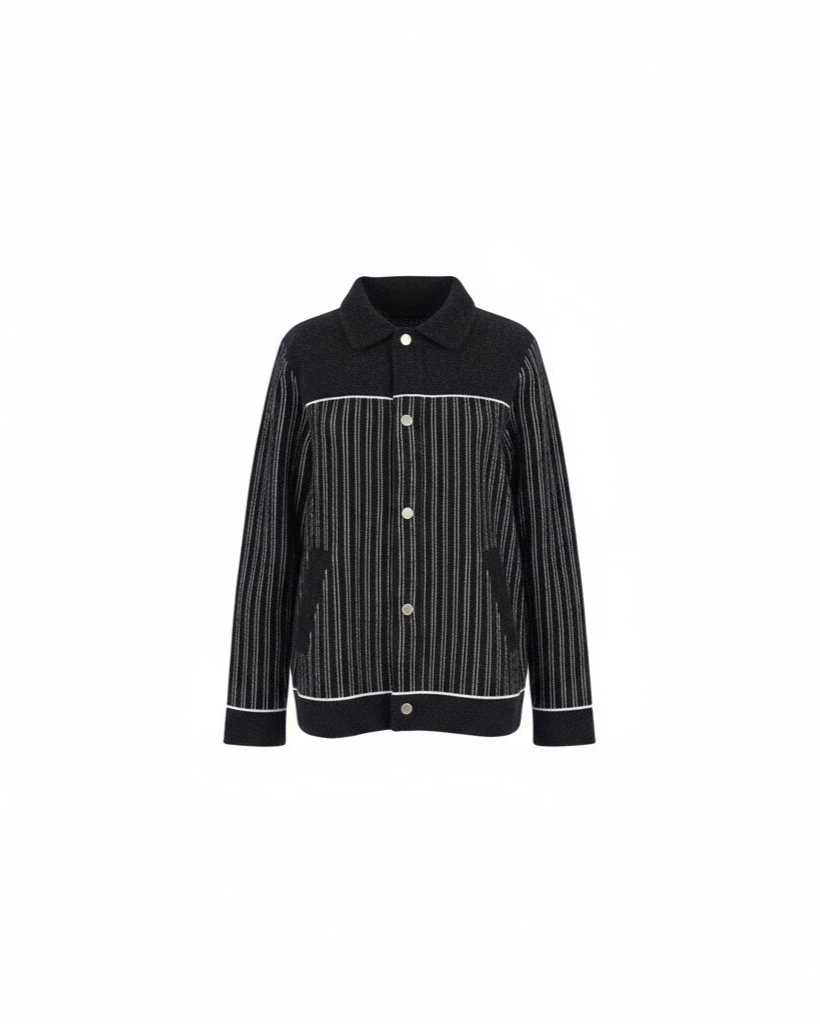 The body of the garment features an intricate vertical pinstripe knit pattern, giving it a rich texture and elongating look. This is beautifully contrasted by the solid-knit collar and shoulder panel, and finished with crisp white contrast trim on the hem and cuffs—a detail that gives the jacket a sophisticated, varsity-inspired edge. (2501)