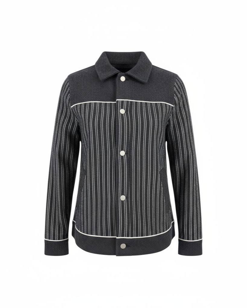 • Unique Pattern Mixing: The combination of the vertical stripe pattern and the solid collar panel creates a visual depth and modern aesthetic.